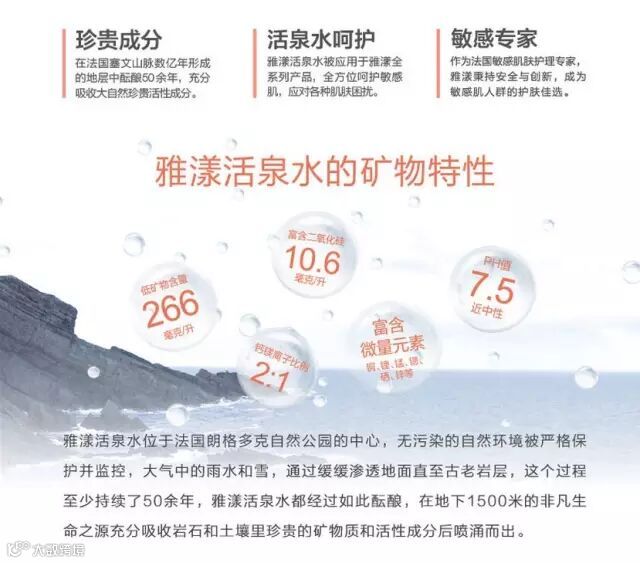雅漾活泉水源自法国的塞文山脉中,每一滴雅漾活泉水都在古老的地层中久久酝酿,充分吸收岩石和土壤里珍贵的矿物质和活性成分后喷涌而出。雅漾活泉具有的舒缓、减少刺激特性,确保了它对敏感肌肤的安全性和耐受性。同时,雅漾活泉的低矿物含量以及均衡的钙镁离子比例给皮肤带来温和呵护。