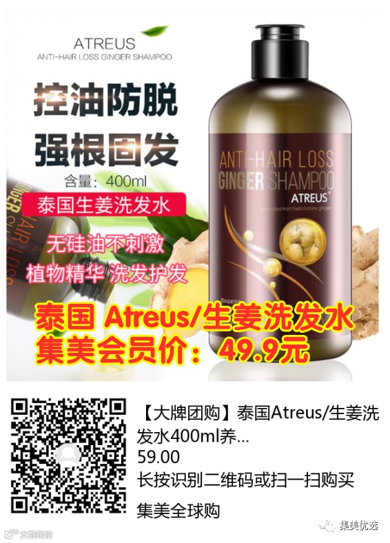 【大牌团购】泰国 Atreus生姜洗发水400ml 团购价:59元 VIP /黑卡M1会员 福利补贴价:49.9元