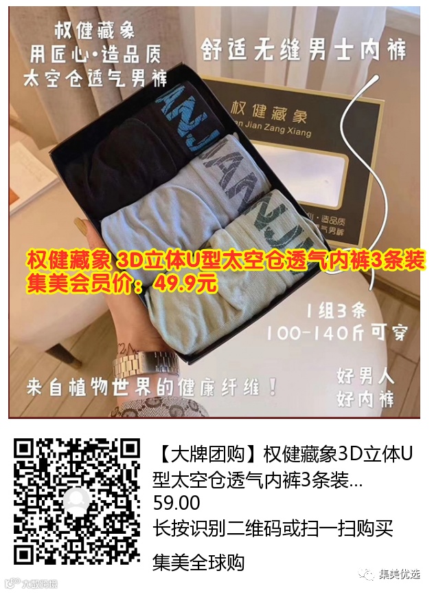 【大牌团购】权健藏象 3D立体U型太空仓透气内裤3条装 团购价:59元 VIP /黑卡M1会员 福利补贴价:49.9元