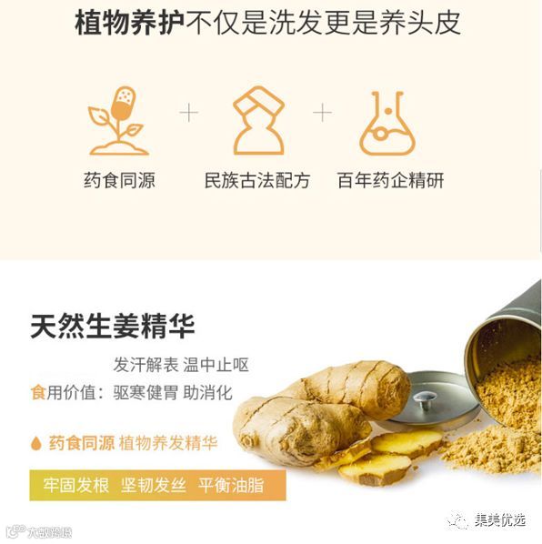 生姜具有解表,发散的功效,外用生姜能增加头部血液循环,刺激毛囊打开,令毛发再生,同时平衡油脂分泌,进而控油去屑。