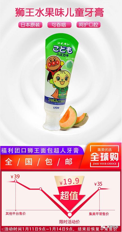 【福利团购】狮王面包超人牙膏哈密瓜味 预防蛀牙40g 2支