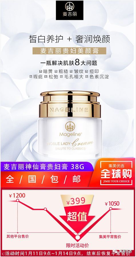 麦吉丽神仙膏贵妇膏因为效果堪称神仙下凡,又名神仙膏。同时其中的配方特别珍贵,更是拥有着胎盘精华,因此又被称为胎盘膏。贵妇膏正是因为拥有着多种名贵配方,因此贵妇膏的功效是特别多的,比如可以抗衰老,去暗黄,收毛孔,美白保湿,淡斑淡印,均匀提亮,防晒隔离,修复红血丝等等,更是拥有着强大的淡斑美白作用
