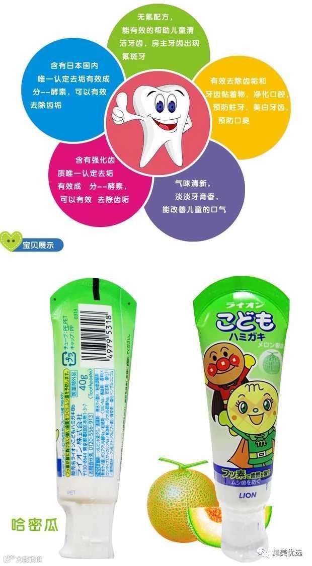 哈密瓜味很清新,还添加了酵素成分,可以有效去除口腔内的牙垢,促进宝宝幼齿的成长。万一有所误食,少量的情况下也是没有关系的,性质温和,成分安全。