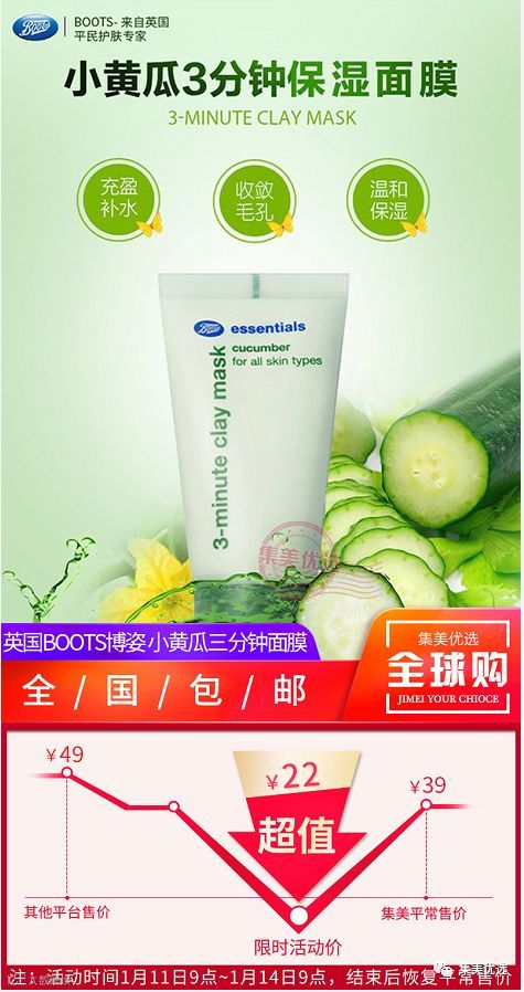 【福利团购】英国Boots博姿 小黄瓜三分钟面膜 50mL