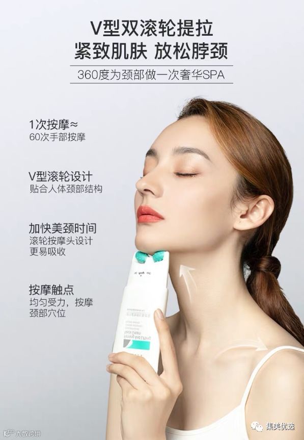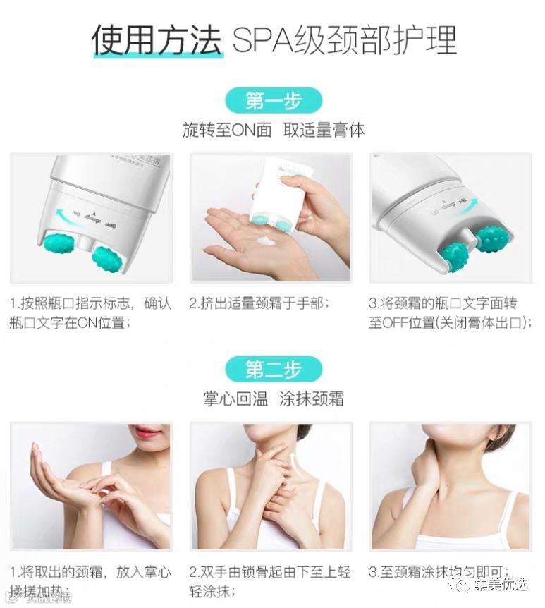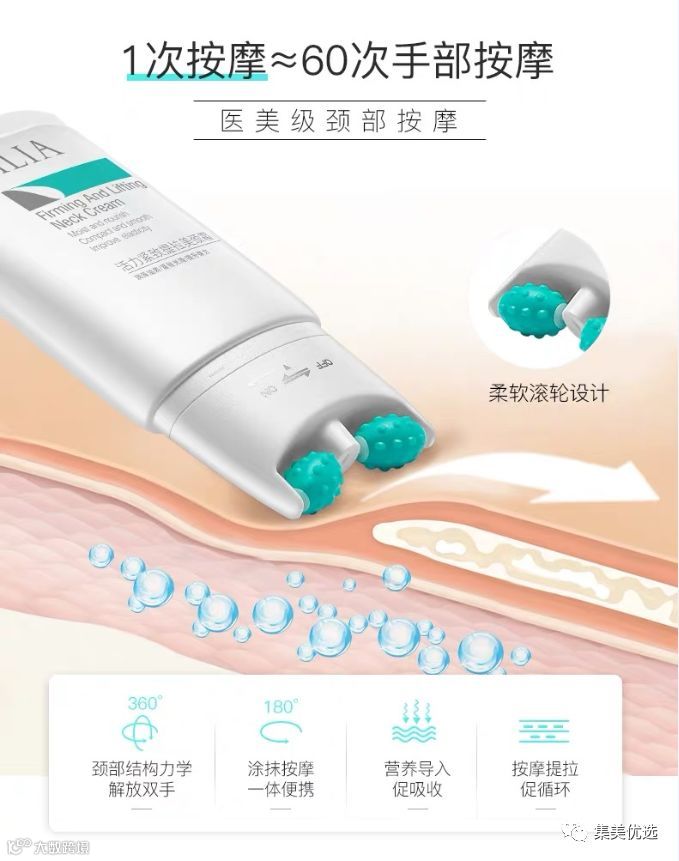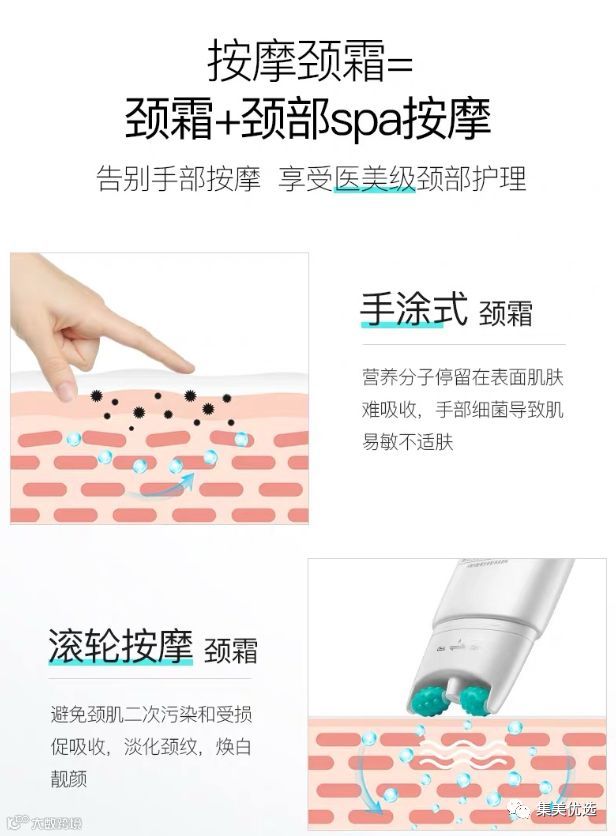 手涂式颈霜的缺陷:营养分子停留在表面肌肤难以吸收,手部细菌导致肌肤敏感不适应滚轮按摩颈霜能避免颈肌二次污染和受损促吸收,淡化颈纹,焕白靓颜!