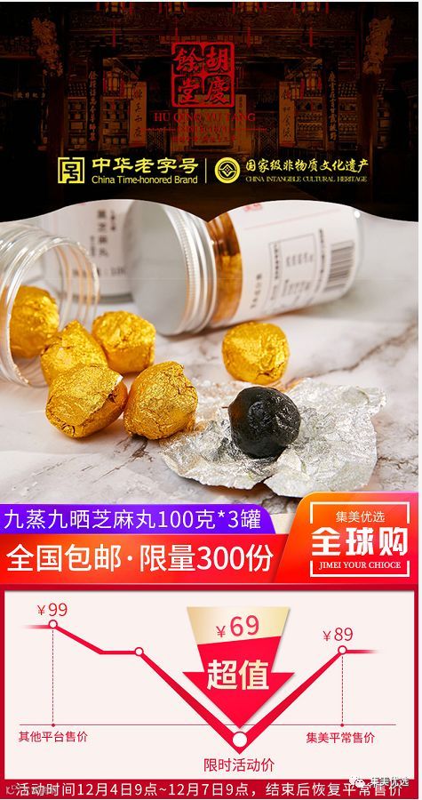 【福利团购】(胡庆余堂)九蒸九晒 芝麻丸 100克*3罐装