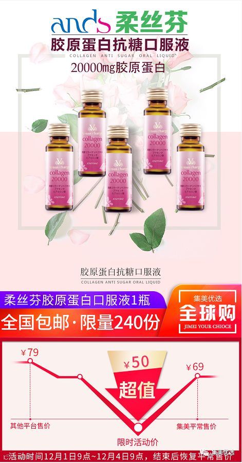 1.每瓶含有20000mg的小分子胶原蛋白,含量更高,更好吸收(目前市面上绝大部分胶原蛋白饮的单瓶含量仅为2500-5000毫克) 。
