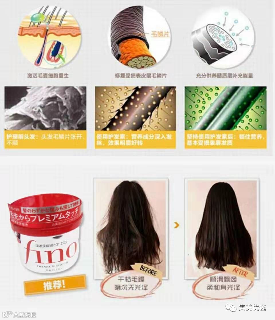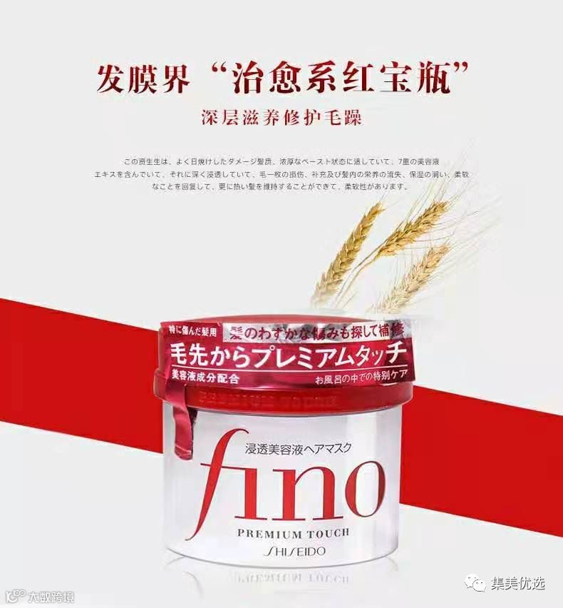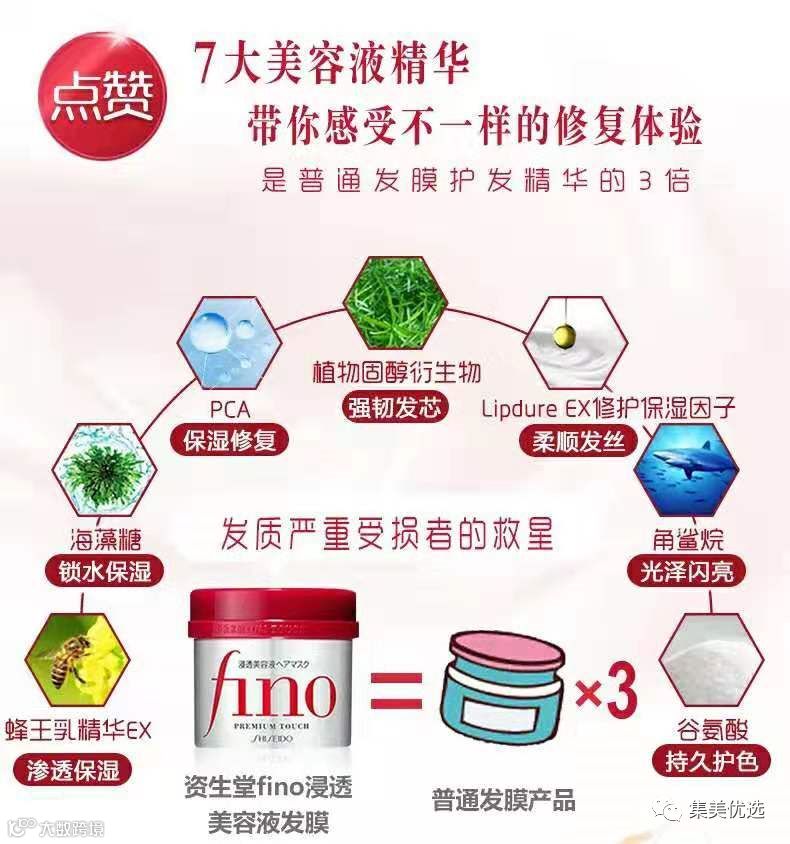 这款Fino发膜以修复和补水为主,蕴含7种美容液精华,深入渗透毛发核心,从根本上缓解因为缺水而引起头发干枯、分叉现象,保湿的同时还能留住必要的水分,增加头发的自重。不再枯燥的头发自然会变得垂顺光滑,充满健康光泽哦~发膜里富含维生素E的小麦胚精华,具有抗氧化效果,能够调理头发表层的毛鳞片,使头发变得更加滋润顺滑!