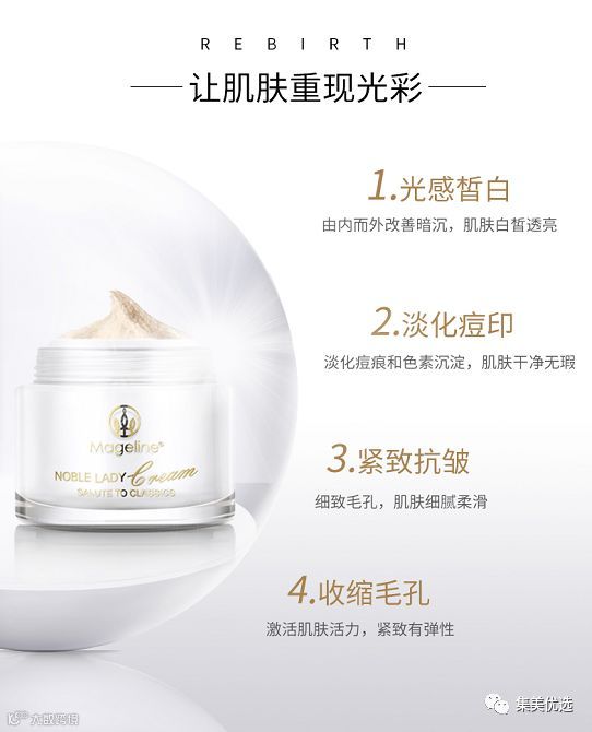 麦吉丽神仙膏贵妇膏因为效果堪称神仙下凡,又名神仙膏。同时其中的配方特别珍贵,更是拥有着胎盘精华,因此又被称为胎盘膏。贵妇膏正是因为拥有着多种名贵配方,因此贵妇膏的功效是特别多的,比如可以抗衰老,去暗黄,收毛孔,美白保湿,淡斑淡印,均匀提亮,防晒隔离,修复红血丝等等,更是拥有着强大的淡斑美白作用