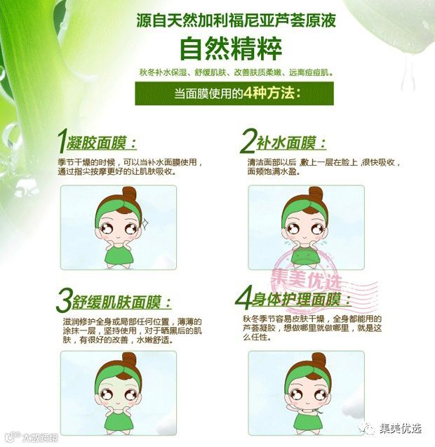 Nature Republic自然乐园芦荟胶有8大用法:搭配面膜使用、紧急水分补给、须后镇静、给头发补水、补水眼膜、指甲护理、身体护理、晒后修复