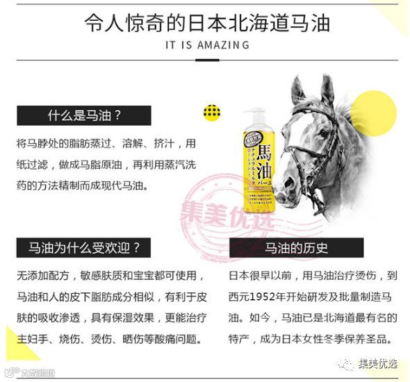采用日本传統古方提煉的北海道天然馬油,并添加天然保湿成分組成,能快速滲透滋養肌肤,令乾燥的肌肤迅速恢复健康、柔軟、嫩滑。是受日本厚生劳动省卫生署认可的商品