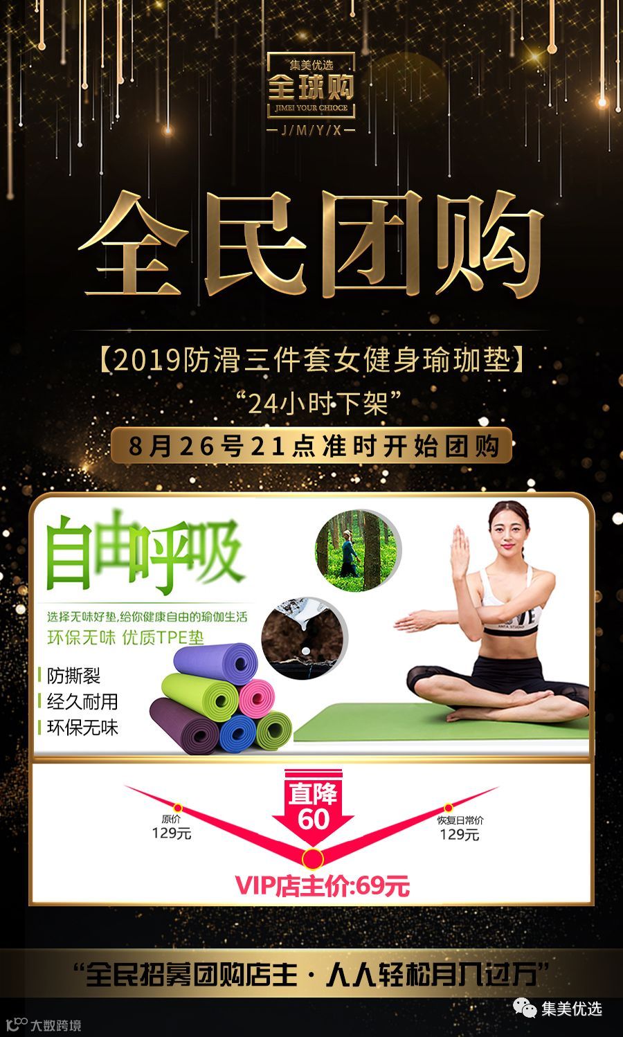 福利团购 【耐克瑜伽垫代工厂】2019欣吉富瑜伽垫无味tpe瑜伽垫初学者加厚加宽加长防滑三件套女健身瑜伽垫