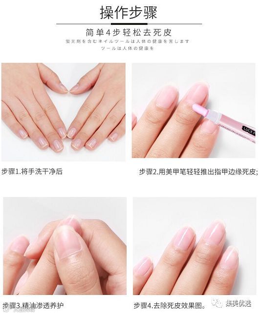 「甘皮」其实是日语里的词汇,意思就是指甲月牙那里自然生长出来的多余角质。这些多余的角质长期不清理的话,就会影响到指甲的光泽度。这款美甲笔相当于死皮推和营养油二合一,它不仅能去角质和死皮,还能分泌出营养的橄榄精油,让指甲周围部分更加强韧,促进指甲健康生长,防止生倒刺。