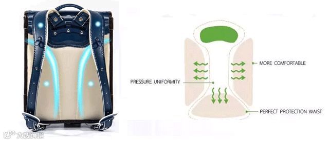 其中,书包背部填充新型加厚海绵,并采用两侧突出,中间凹陷的护脊设计,能够为脊椎留出安全空间,同时支撑背部和腰部。。。