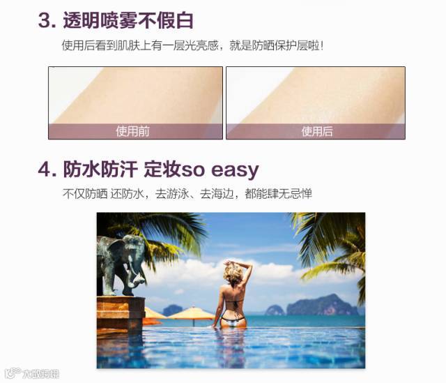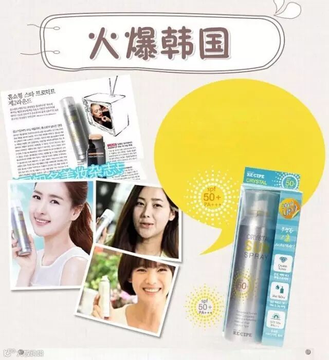 韩国RE:CIPE莱斯璧水晶防晒喷雾,八效合一,360°贴合防晒。防晒、全透明、防水、定妆、保湿、清爽、SPF50+PA+++,防晒时间长达12小时,非常清爽,完全不留白,彻底防御紫外线,不受汗水和皮脂的影响,超强防水功能,夏日海边出游必备神器,皮肤潮湿的情况下也可以直接使用。没有油腻或黏着感,化妆后使用不仅可以阻挡紫外线,还能起到定妆效果。透明的颜色不用担心脱妆,敏感肌肤甚至孕妇都可用!