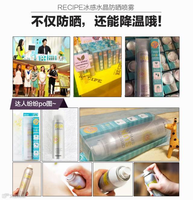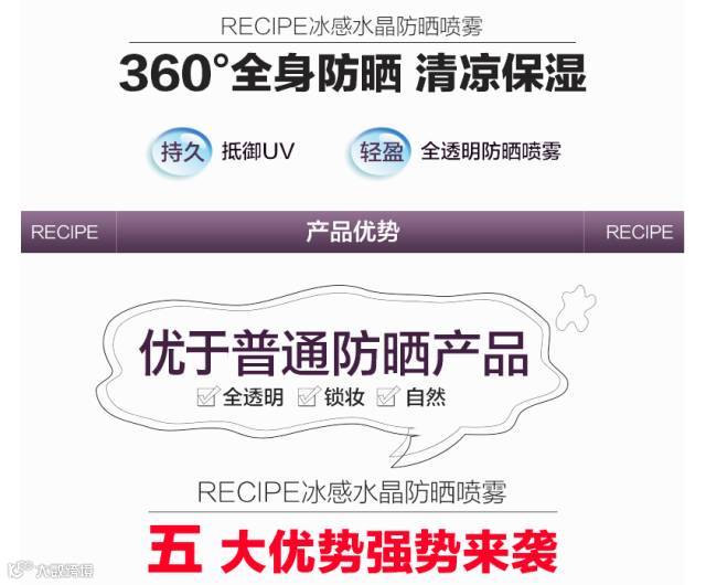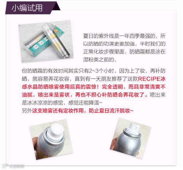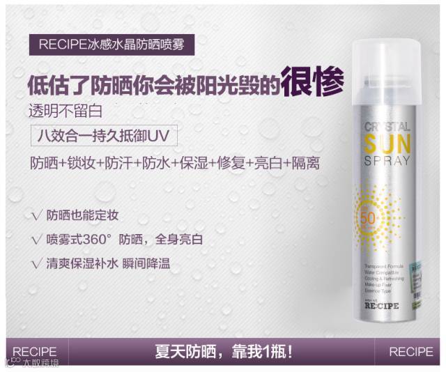 RE:CIPE水晶防晒喷雾采用60余种珍贵天然成分,除了防晒外还能给皮肤不断滋养并同时对疲劳肌肤有镇定功效,喷洒出来的雾面如水晶完全透明的覆盖在肌肤上,再也不用担心搓白泥的尴尬和闷痘的可怕~