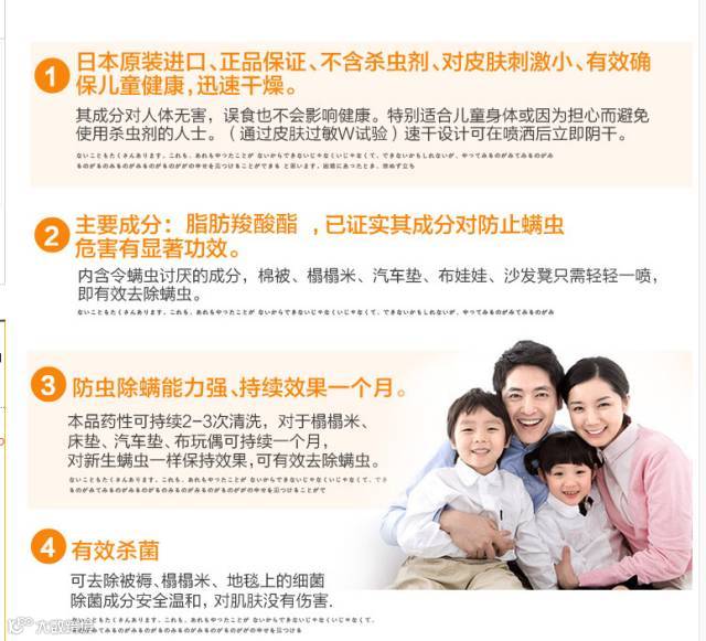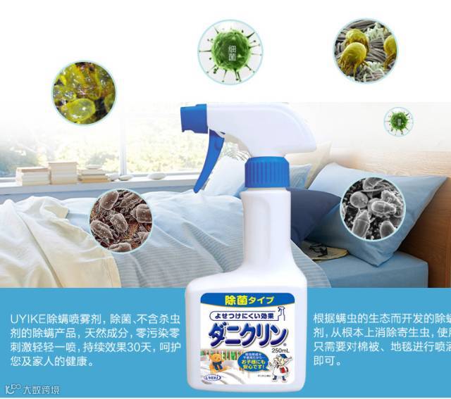 产品原理不含杀虫剂,而是添加了“脂类系羧酸脂”,(螨虫以食人体的皮屑、皮垢、食物等,喷洒是将螨虫食物的表面附着抑虫药品原理是杀死螨虫食物链)令螨虫讨厌从物品深处全部爬出来,不再聚集,不在喷过除螨的地方产卵繁衍。除螨无法使用杀虫剂,只可驱赶,因为螨虫死后尸体与粪便接触皮肤引起的过敏要远远大于被咬。婴儿孕妇可用,有效从根本上安全灭螨的除螨剂。一次使用驱除螨虫效果长达一个月左右,经济实惠。本品经过日本抗过敏协会认证,经过皮肤过敏测试,不刺激皮肤,经过急性毒性测试(经口服)为无毒(等同于砂糖)实在是有孩子的家庭安心之选。