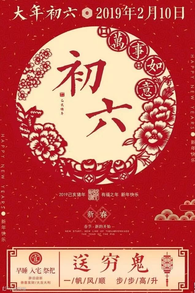 大年初六送穷日,早安励志早安正能量的祝福送你愿顺畅:好运安康伴吉祥,烦恼全消忧伤跑;贫穷困难不见了,幸福美满哈哈笑。正月初六祝福你,猪年幸福,福星高照!