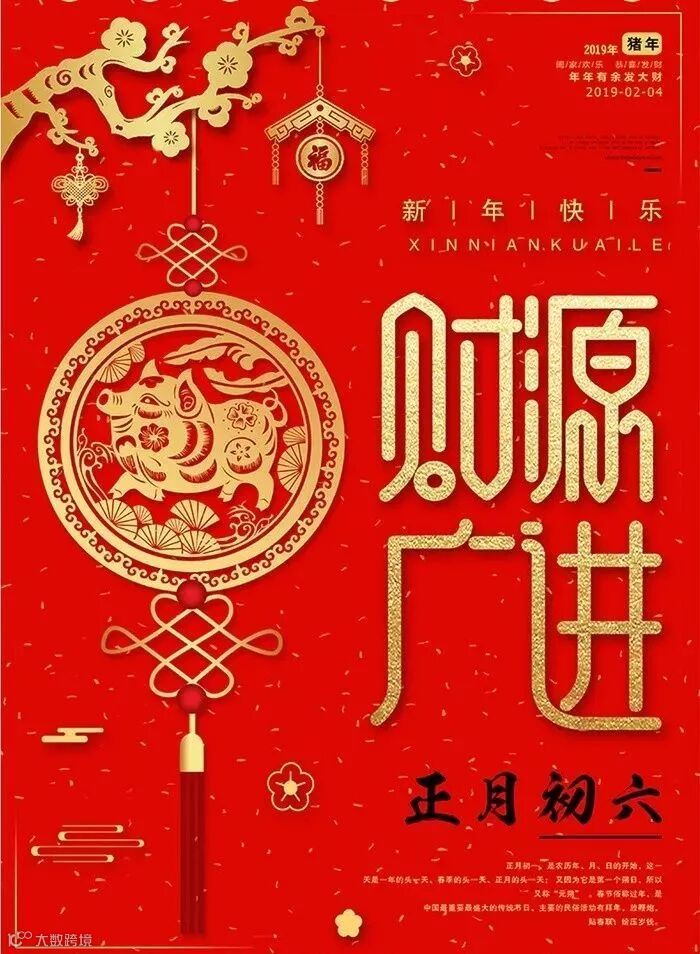 大年初六到,迎财送穷跑不掉:财源滚滚往家跑,穷神无处来躲藏;送穷招财财运绕,金银财宝满腰包;家和美满甜蜜笑,富贵吉祥多热闹。祝猪年大吉!