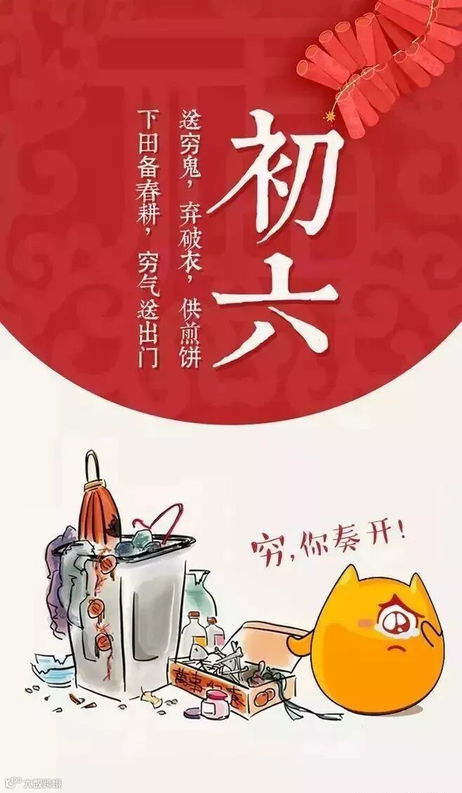 大年初六,迎财送穷;垃圾清扫,霉运清除;室内打扫,迎财纳福;焚香拜神,祈求大利;爆竹烟花,辟邪免灾。早安心语早安祝福祝你狗年吉祥如意,顺顺利利!