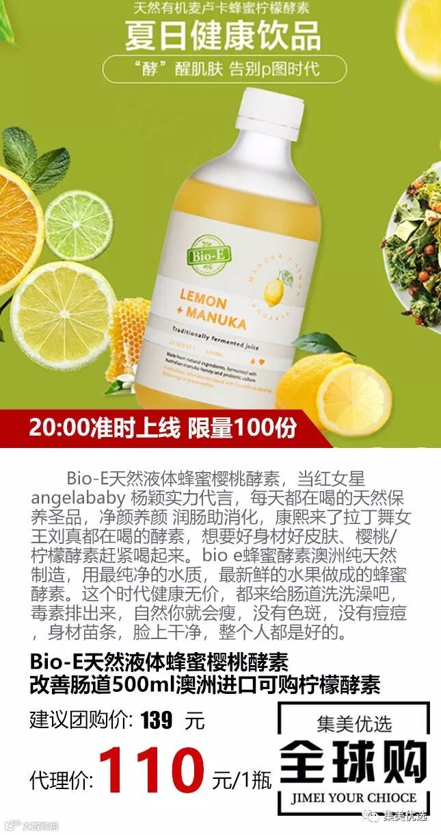 澳洲唯一一款液体酵素 拉丁舞女王刘真都在喝的酵素,想要好身材好皮肤、柠檬酵素赶紧喝起来。bio-e柠檬酵素澳洲纯天然制造,用最纯净的水质,最新鲜的水果做成的柠檬酵素。这个时代健康无价,都来给肠道洗洗澡吧,毒素排出来,自然你就会瘦,没有色斑,没有痘痘,身材苗条,脸上干净,让身体年轻态!