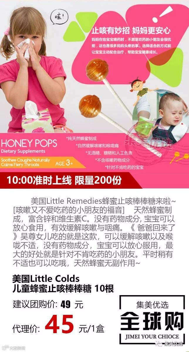 美国Little Remedies蜂蜜止咳棒棒糖来啦~ [咳嗽又不爱吃药的小朋友的福音] 天然蜂蜜制成,富含锌和维生素C。没有药物成分, 宝宝可以放心食用,有效缓解咳嗽与咽痛。《 爸爸回来了》吴尊女儿吃的就是这款,可以缓解咳嗽以及喉咙不适,没有药物成分,宝宝可以放心服用,最大的好处就是针对不肯吃药的小朋友。平时稍有不适也可以吃哦,天然蜂蜜无副作用~