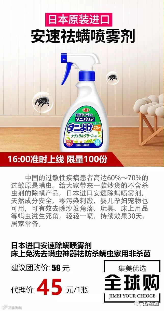 中国的过敏性疾病患者高达60%~70%的过敏原是螨虫。给大家带来一款炒货的不含杀虫剂的除蟥产品,日本进口安速除螨喷雾剂,天然成分安全,零污染刺激,婴儿孕妇宠物也可用,可有效去除沙发角落、玩具、床上用品等螨虫滋生死角,轻轻一喷,持续效果30天,居家常备~