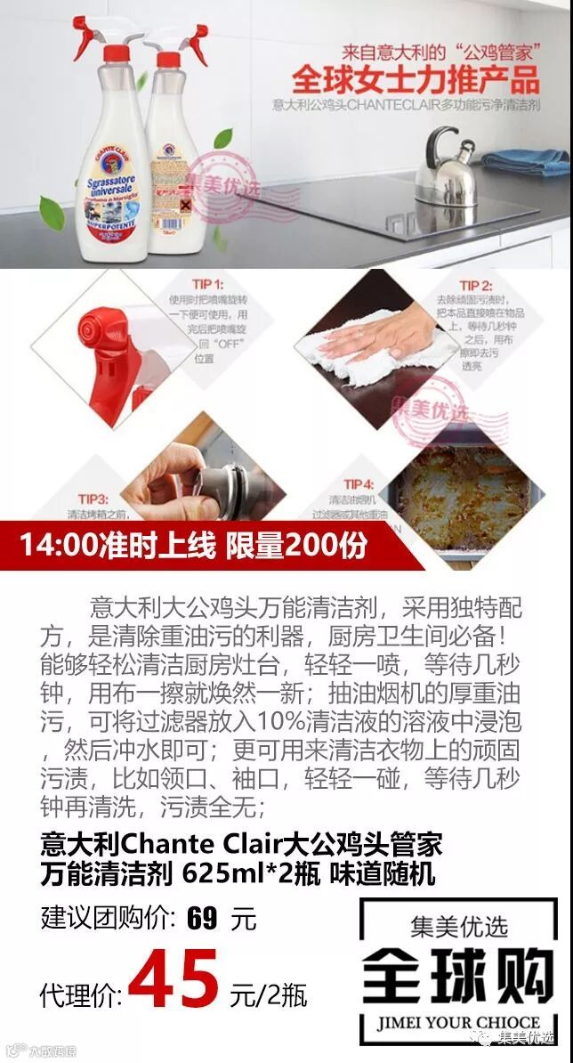 意大利大公鸡头万能清洁剂,采用独特配方,是清除重油污的利器,厨房卫生间必备!能够轻松清洁厨房灶台,轻轻一喷,等待几秒钟,用布一擦就焕然一新,抽油烟机的厚重油污,可将过滤器放入10%清洁液的溶液中浸泡,然后冲水即可,更可用来清洁衣物上的顽固污渍,比如领口、袖口,轻轻一碰,等待几秒钟再清洗,污渍全无~