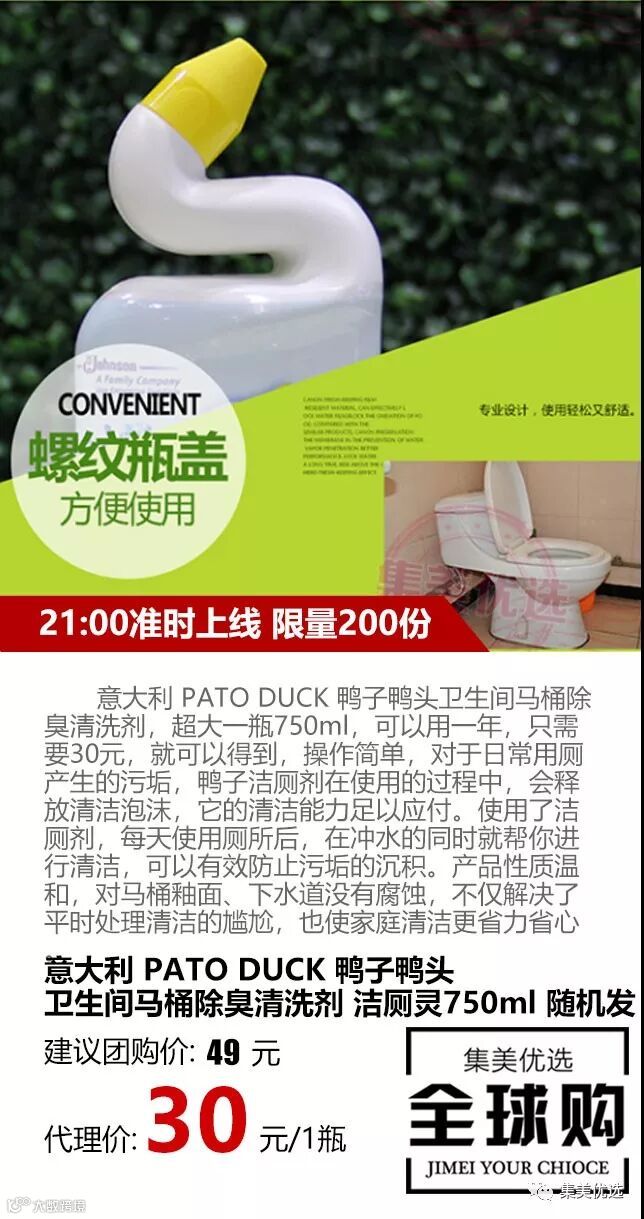 意大利 PATO DUCK 鸭子鸭头卫生间马桶除臭清洗剂,超大一瓶750ml,可以用一年,对于日常用厕产生的污垢,鸭子洁厕剂在使用的过程中,会释放清洁泡沫,它的清洁能力足以应付。使用了洁厕剂,每天使用厕所后,在冲水的同时就帮你进行清洁,可以有效防止污垢的沉积。产品性质温和,对马桶釉面、下水道没有腐蚀,不仅解决了平时处理清洁的尴尬,也使家庭清洁更省力省心~