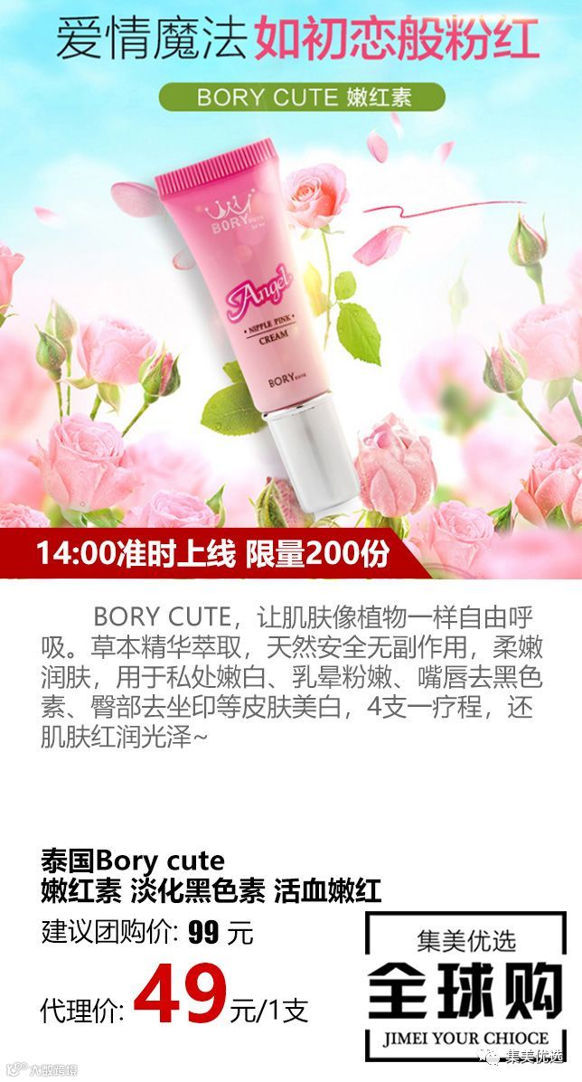 BORY CUTE,让肌肤像植物一样自由呼吸。草本精华萃取,天然安全无副作用,柔嫩润肤,用于私处嫩白、乳晕粉嫩、嘴唇去黑色素、臀部去坐印等皮肤美白,4支一疗程,还肌肤红润光泽~