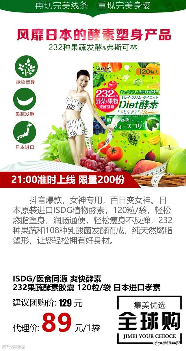抖音爆款,女神专用,百日变女神。日本原装进口ISDG植物酵素,120粒/袋,轻松燃脂塑身,润肠通便,轻松瘦身不反弹,232种果蔬和108种乳酸菌发酵而成,纯天然燃脂塑形,让您轻松拥有好身材。