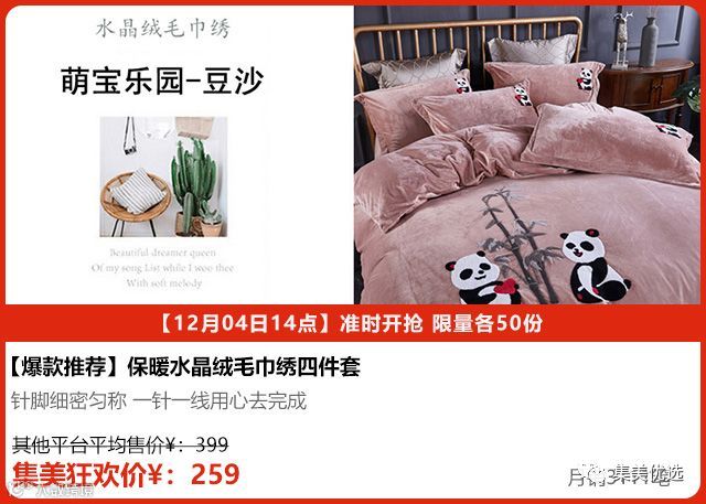 水晶绒熊猫四件套萌萌哒造型,抗菌工艺赋予亲肤健康的特性,织物表面色调与光泽柔和,手感更加柔软。 轻微皱度体现几分旧料之感,免熨烫。 国宝散发着迷人的气息,彰显随性自由的态度,流露独特的个性魅力和清纯淡雅的时尚气质~