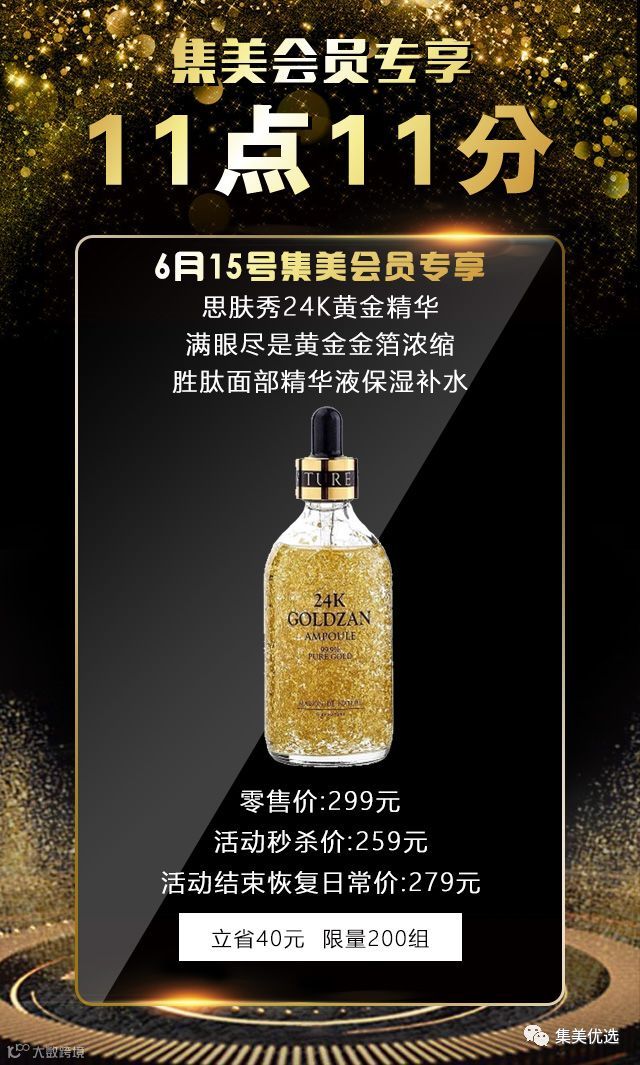 6月15日,11:11,思肤秀24K黄金精华 满眼尽是黄金金箔浓缩胜肽面部精华液保湿补水,原价299元,活动秒杀价259元,限量200份,手慢无!!!