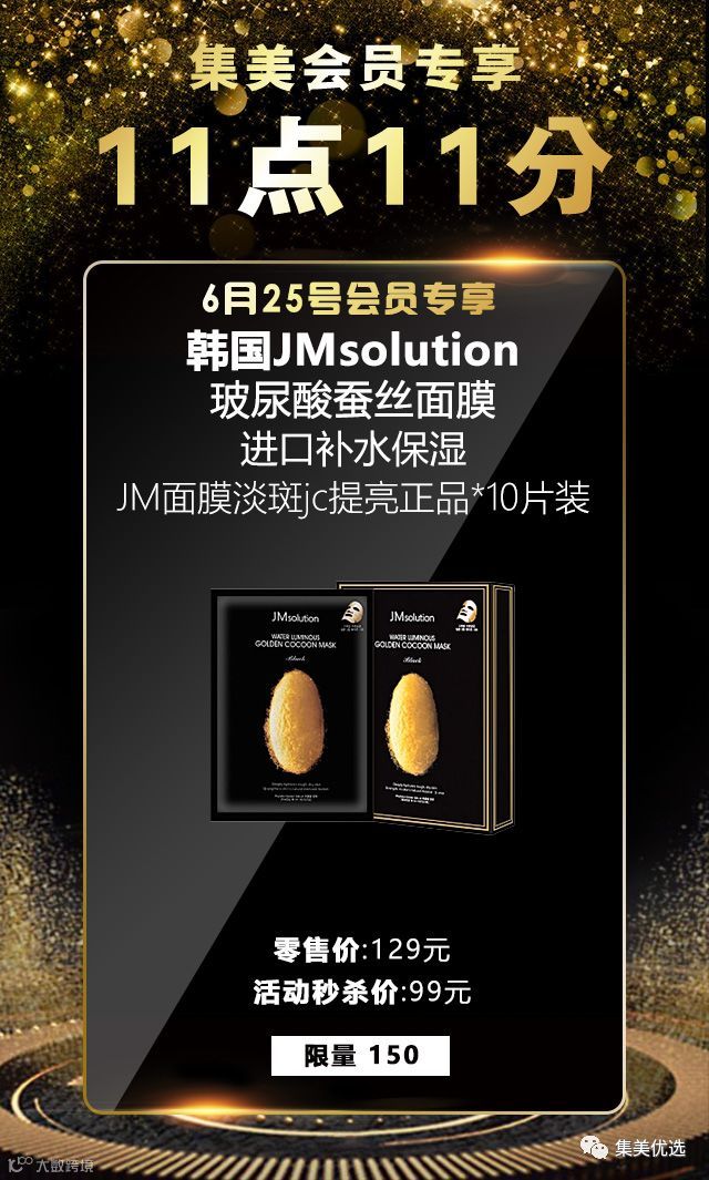 6月25日,11:11,韩国JMsolution玻尿酸蚕丝面膜进口补水保湿JM面膜淡斑jc提亮正品*10片装 ,原价129元,活动秒杀价99元,限量150份,手慢无!!!