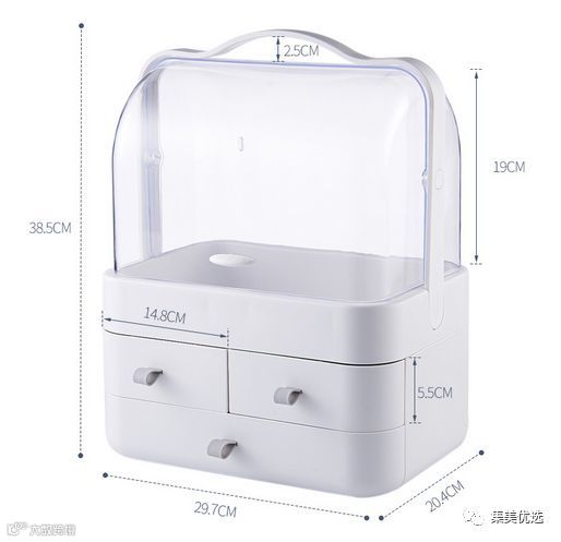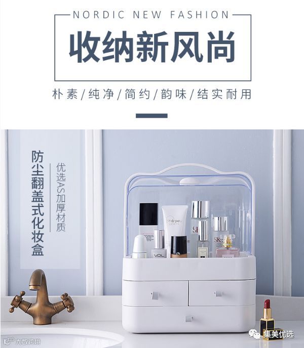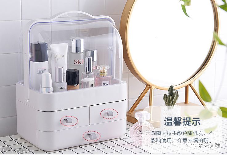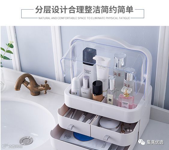 女神养成记,先从一款浪漫的梳妆台开始,对爱美的姑娘们来说,护肤化妆是堪比睡觉吃饭一般重要的事情。一个合格的梳妆台,镜子、照明、护肤品的储藏空间都是必不可少的。集美甄选新品化妆品收纳盒透明手提桌面抽屉式梳妆台整理盒护肤品置物架,优选AS加厚材质,防尘翻盖式化妆盒,可以防尘防水,分层设计合理简洁,非常实用,方便归纳日常护肤品,既节约空间又简洁方便。
