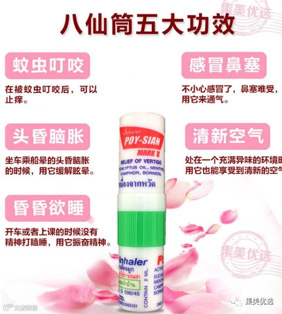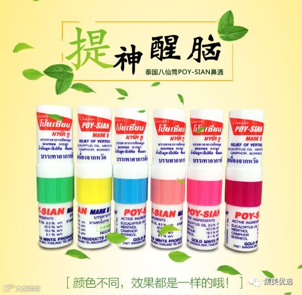【Poy-sian八仙筒】被公认为泰国最舒服的一款鼻通。一头是鼻吸,一头是药油,可以点在太阳穴,一支两用。鼻子敏感不通气,可将鼻通的一边放入鼻中嗅一嗅就行了。头痛,头晕,晕车,瞌睡没精神时可将八仙筒的一边放入鼻中嗅一嗅再把另一边在太阳穴上轻 轻点一点,再轻轻的按摩太阳穴。被蚊虫叮咬,把鼻通的油这边擦在伤口上。