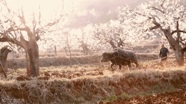 果农拉来老牛犁地,保持土壤的水分和松弛,每家每户都会调配农家肥进行浇灌。