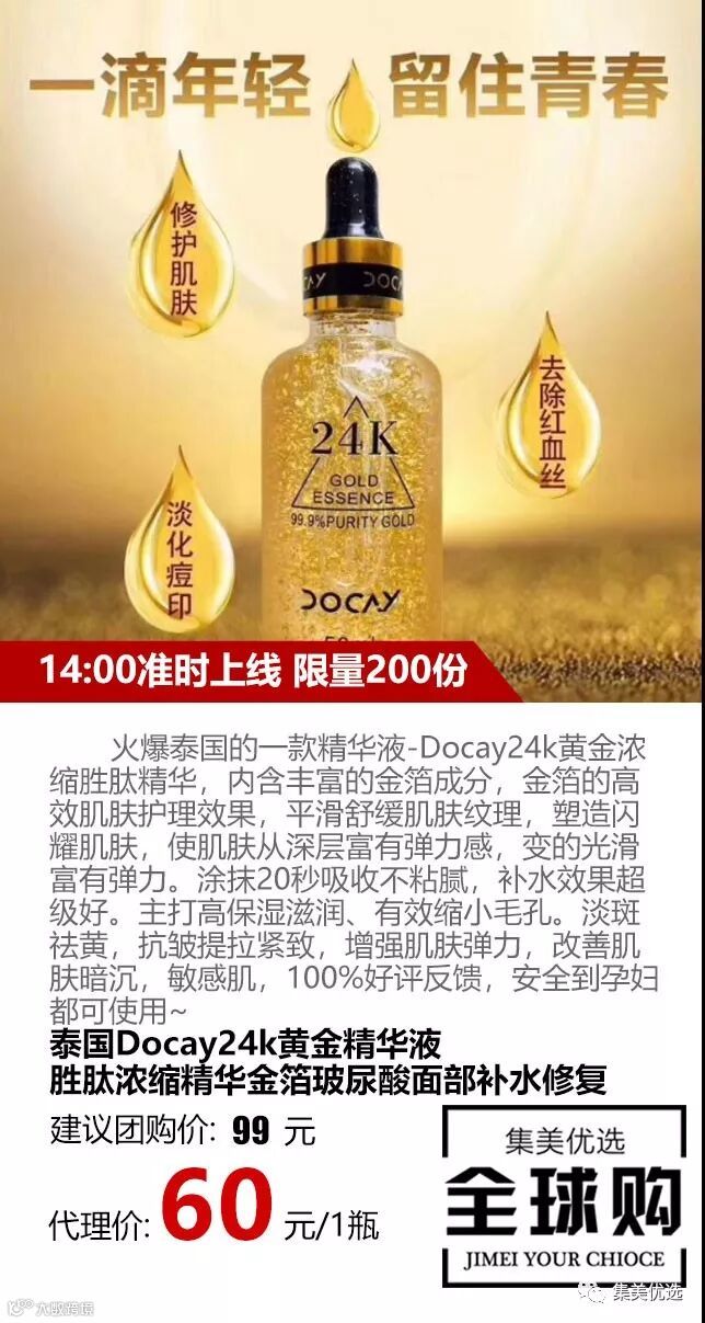 火爆泰国的一款精华液-Docay24k黄金浓缩胜肽精华,内含丰富的金箔成分,金箔的高效肌肤护理效果,平滑舒缓肌肤纹理,塑造闪耀肌肤,使肌肤从深层富有弹力感,变的光滑富有弹力。涂抹20秒吸收不粘腻,补水效果超级好。主打高保湿滋润、有效缩小毛孔。淡斑祛黄,抗皱提拉紧致,增强肌肤弹力,改善肌肤暗沉,敏感肌,100%好评反馈,安全到孕妇都可使用~