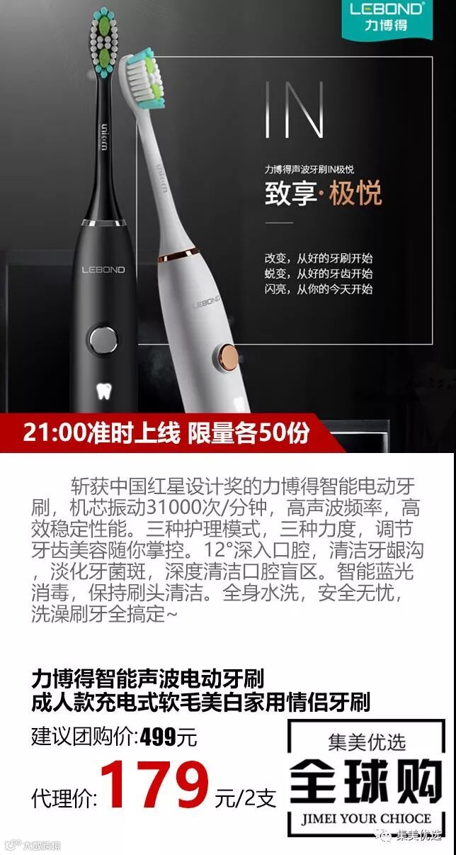 斩获中国红星设计奖的力博得智能电动牙刷,机芯振动31000次/分钟,高声波频率,高效稳定性能。三种护理模式,三种力度,调节牙齿美容随你掌控。12°深入口腔,清洁牙龈沟,淡化牙菌斑,深度清洁口腔盲区。智能蓝光消毒,保持刷头清洁。全身水洗,安全无忧,洗澡刷牙全搞定~