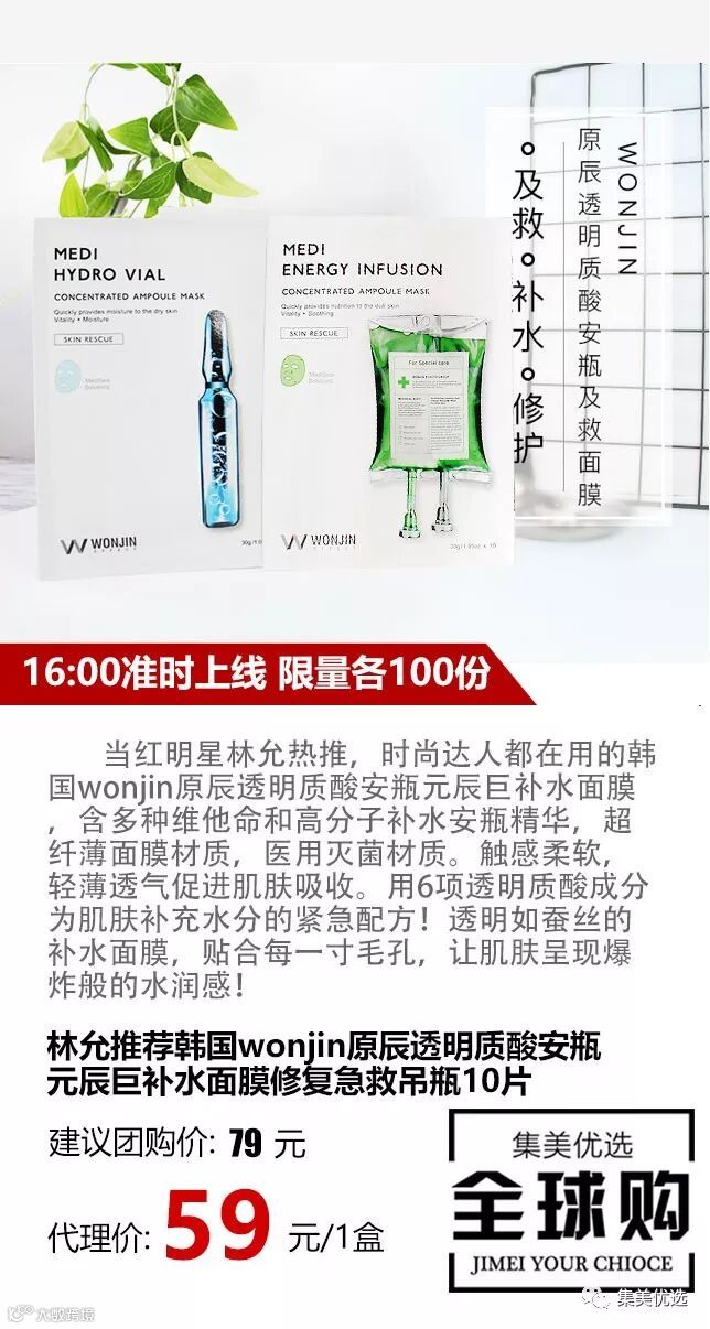 当红女星林允热推,时尚达人都在用的韩国wonjin原辰透明质酸安瓶元辰巨补水面膜,含多种维他命和高分子补水安瓶精华,超纤薄面膜材质,医用灭菌材质。触感柔软,轻薄透气促进肌肤吸收。用6项透明质酸成分为肌肤补充水分的紧急配方!透明如蚕丝的补水面膜,贴合每一寸毛孔,让肌肤呈现爆炸般的水润感!
