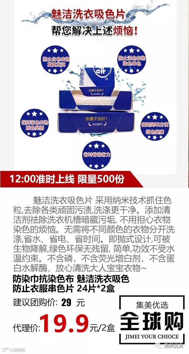 魅洁洗衣吸色片 采用纳米技术抓住色粒,去除各类顽固污渍,洗涤更干净。添加清洁剂祛除洗衣机槽暗藏污垢, 不用担心衣物染色的烦恼。无需将不同颜色的衣物分开洗涤,省水、省电、省时间。即抛式设计,可被生物降解,绿色环保无残留, 简单,功效不受水温约束。不含磷,不含荧光增白剂,不含蛋白水解酶,放心清洗大人宝宝衣物~