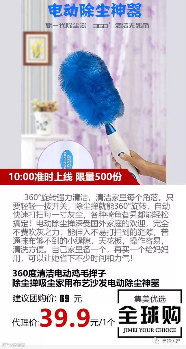 360°旋转强力清洁,清洁家里每个角落。只要轻轻一按开关,除尘掸就能360°旋转,自动快速打扫每一寸灰尘,各种犄角旮旯都能轻松搞定!电动除尘掸深受国外家庭的欢迎,完全不费吹灰之力,能伸入不易打扫到的缝隙,普通抹布够不到的小缝隙,天花板,操作容易,清洗方便。自己家里备一个,再买一个给妈妈用,可以让她省下不少时间和力气!