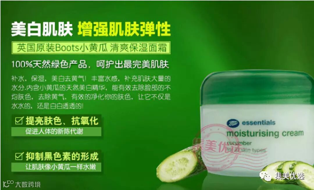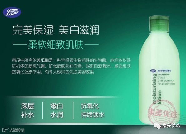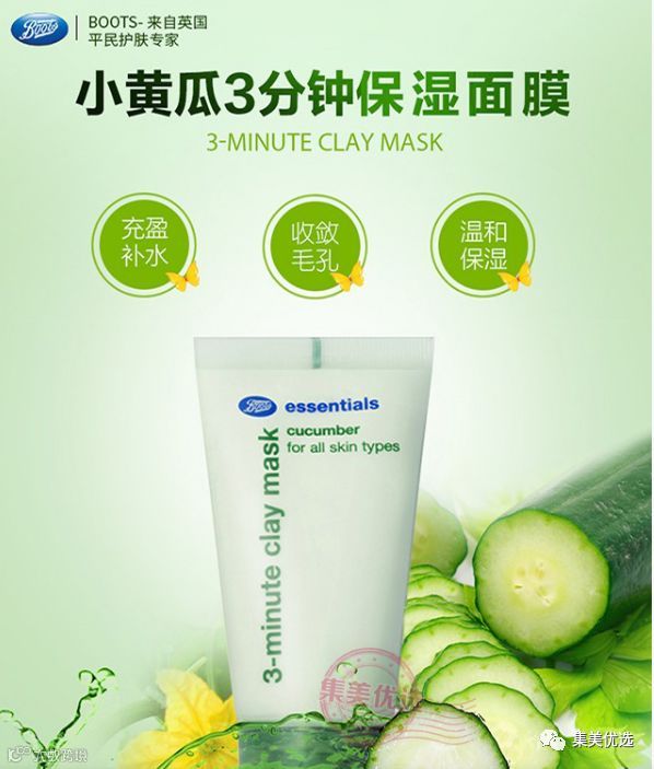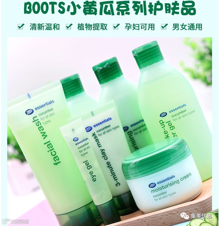 来自英国的博姿(Boots)小黄瓜专柜遍布全球,超3000家专卖店。Boots是英国最大的连锁药店,也是英国专业药妆的代表。英国Boots Essentials小黄瓜脸部护理系列可是英国人气TOP1!!好用的同时,价格还很亲民。boots整套系列!每一样都不容错过,boots小黄瓜系列的特色就是:补水、保湿、清爽不油腻,温和,所以孕妇、敏感肌也可以用啦~含有黄瓜的美白功效,boots最最最重要的就是平价大碗!干性、油性、混合型肤质可以用,性价比高的没话说