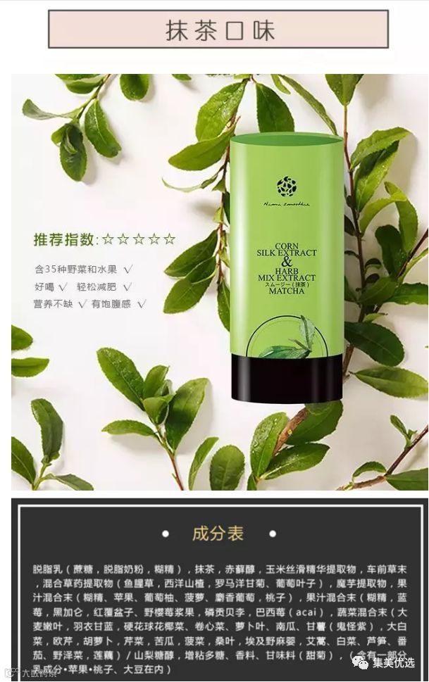 抹茶:采用日本最高级别抹茶为原料,抹茶中的茶素可有效地燃烧体内脂肪。
