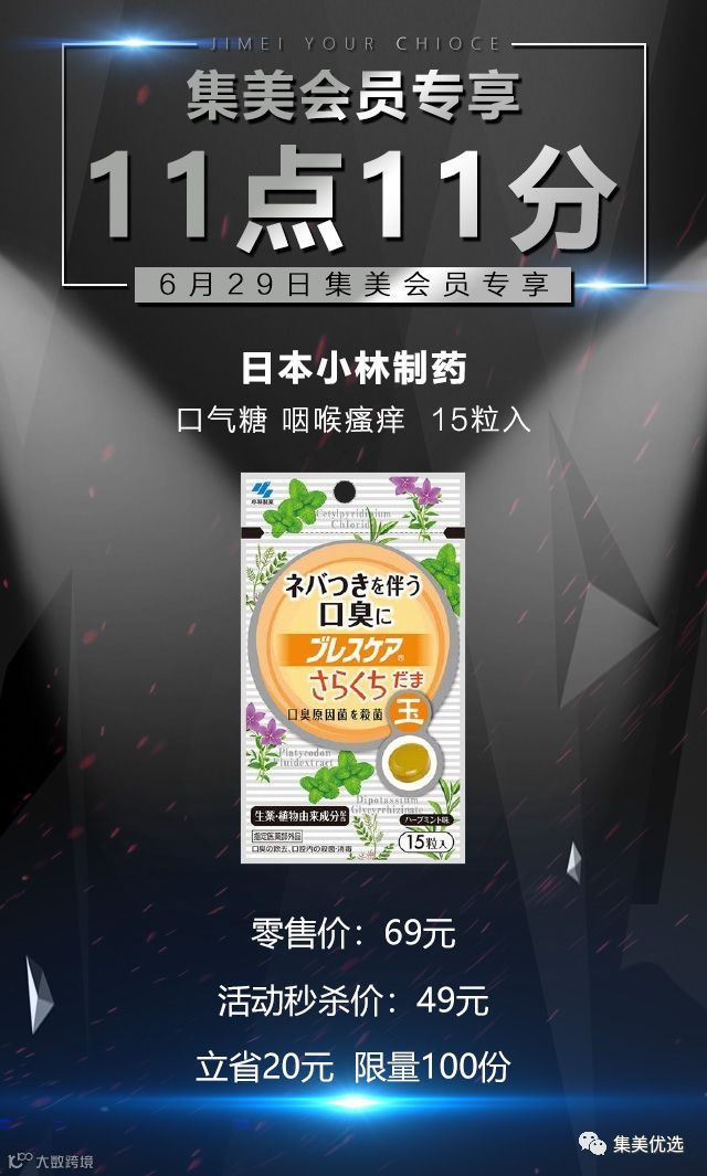 6月29日,11:11,日本小林口气糖 咽喉瘙痒 15粒入,一盒原价69元,建议零售价49元,限量100份手慢无!!!