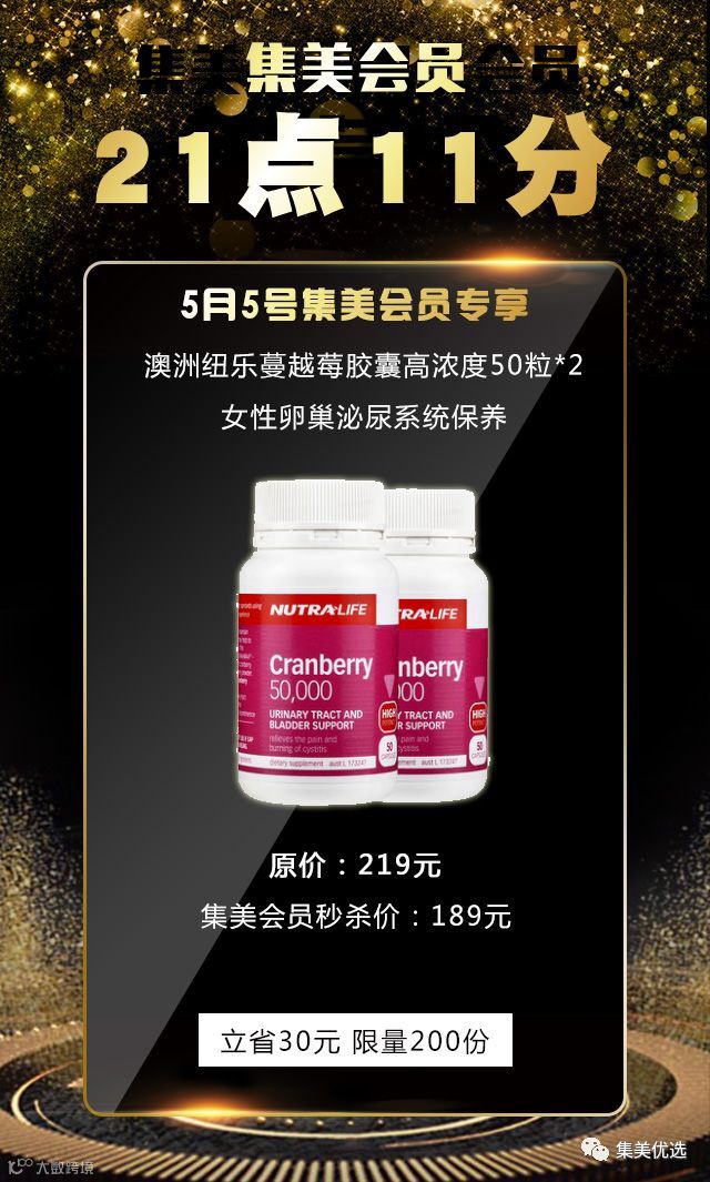 5月5日,21:11,nutralife纽乐蔓越莓精华50粒女性保养品泌尿系统曼越莓胶囊,浓度50000毫克,SWISSE是25000毫克原价219元,建议零售价189元,限量各200份,手慢无!!!