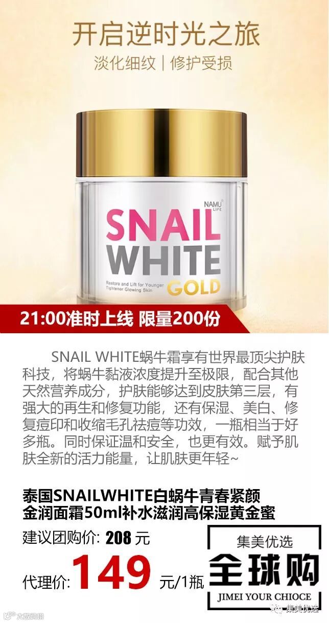 SNAIL WHITE蜗牛霜享有世界最顶尖护肤科技,将蜗牛黏液浓度提升至极限,配合其他天然营养成分,护肤能够达到皮肤第三层,有强大的再生和修复功能,还有保湿、美白、修复痘印和收缩毛孔祛痘等功效,一瓶相当于好多瓶。同时保证温和安全,也更有效。赋予肌肤全新的活力能量,让肌肤更年轻~
