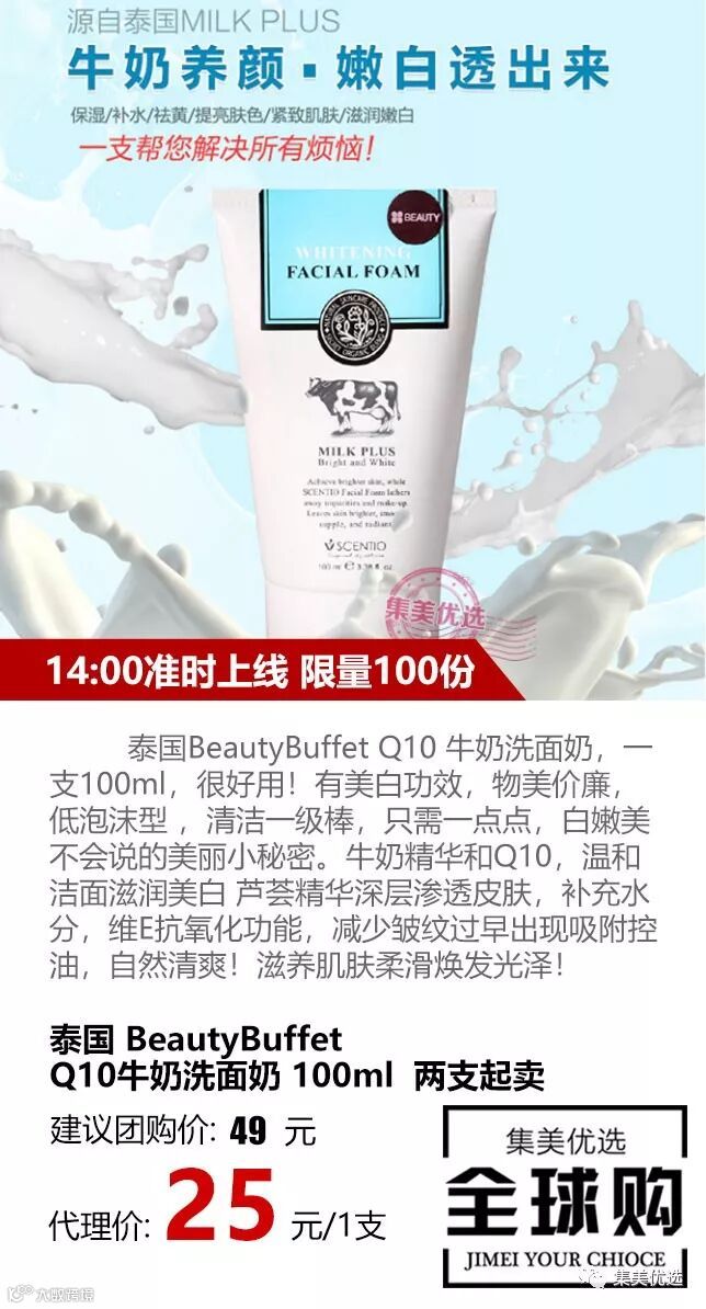 泰国BeautyBuffet Q10 牛奶洗面奶,一支100ml,很好用!有美白功效,物美价廉,低泡沫型 ,清洁一级棒,只需一点点,白嫩美不会说的美丽小秘密。牛奶精华和Q10,温和洁面滋润美白 芦荟精华深层渗透皮肤,补充水分,维E抗氧化功能,减少皱纹过早出现吸附控油,自然清爽!滋养肌肤柔滑焕发光泽!