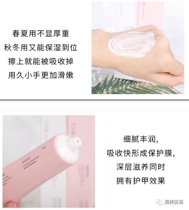 细节决定一切,精致的宝宝手也要美!这款护手霜质地薄厚适中,夏天用也不会觉得黏腻,滋润好吸收,非常亲肤~冬天可以涂厚一点做手膜使用,涂上去静置十分钟左右按摩至吸收就可以啦。所有肤质都可以使用哒,给我们的双手穿上保护衣~