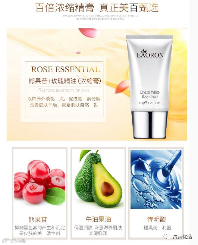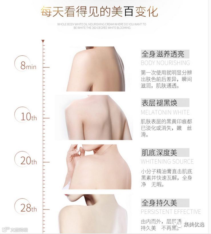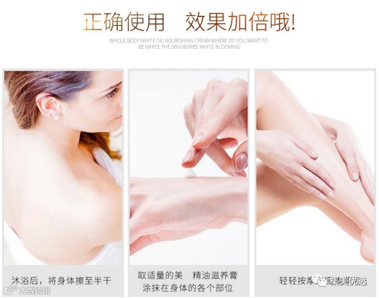EAORON身体乳在美白的同时还有提亮肤色、遮瑕、收细毛孔的效果。紫外线吸收剂二氧化钛在肌肤表面形成有力“防护”,阻止紫外线的同时还可提亮肤色。配合橄榄果油、天然植物维E、乳木果脂、甜杏仁油等澳洲植物精粹,美白、隔离、遮瑕、保湿、防晒一步到位。肌肤白嫩富弹,亮泽发光,你也可以有!想穿什么穿什么,香肩、美腿随便露的感觉,只有体验过才知道。
